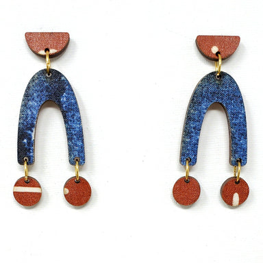 Tribal Denim Geometric Dangle Earrings A beautiful blend of caramel tribal fabric and patchwork denim applied to birch wood and laser cut to create...