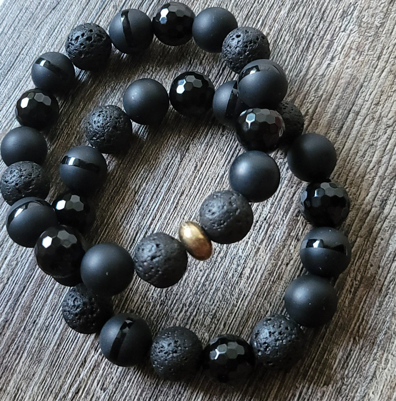 Unisex All Black Everything Bracelet 12mm faceted, matte, stripe black onyx, and lava rock beads, with gold accent bead. Classic gemstone bracelet ...