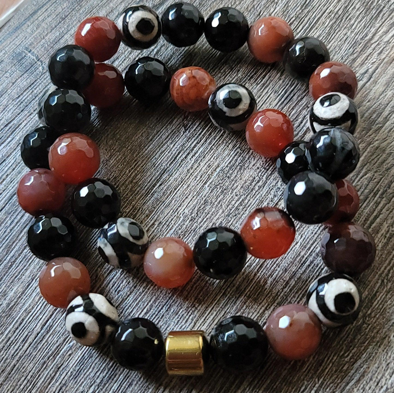 Unisex All Black Everything Bracelet 12mm faceted, matte, stripe black onyx, and lava rock beads. Classic gemstone bracelet makes a bold statement....