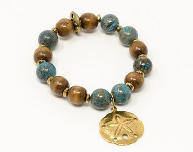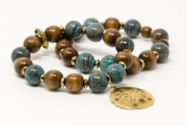 Ocean jasper, wood and brass beads, with brass sand dollar charm bracelet set. Sold separately or as a set. Every item sold plants a tree through o...