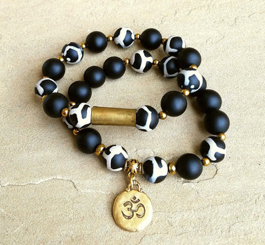 Tibetan agate, matte black onyx, gold hematite, recycled brass bullet shell and om charm bracelet set. Bracelet is approximately 7". Bohemian style...