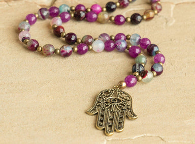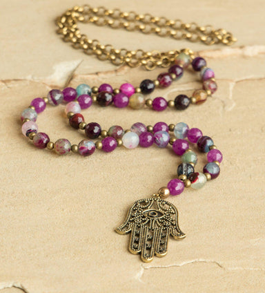 Purple agate, gold hematite and antique brass chain with hamsa pendant. Bohemian style necklace is approximately 32". Looks great with the Flame Pa...