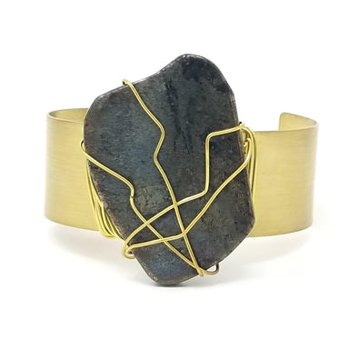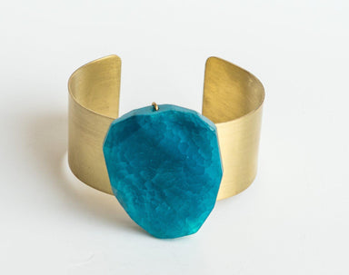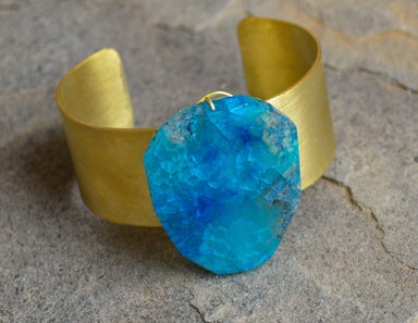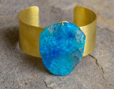 Blue agate slice wire wrapped to recycled brass cuff, with matte brush finish. Each cuff will slightly differ due to the freeform stone and wire wr...