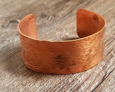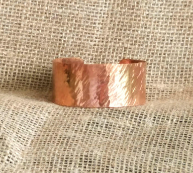 Recycled copper handmade cuff hammered to give woodgrain texture. Fits approximately 6 1/2 - 7 inch wrist and 1 inch in width.