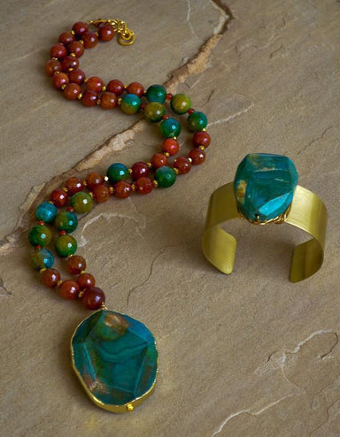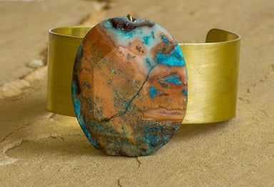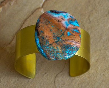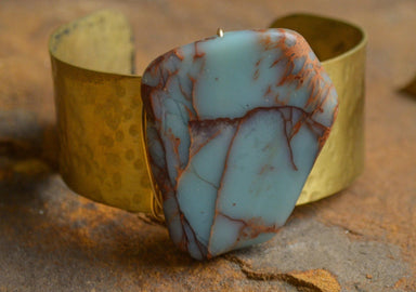 Ocean Jasper slab wire wrapped to hand forged, recycled brass cuff. Stone and texture may vary due to the handmade nature of each item. Fits 6.5" -...