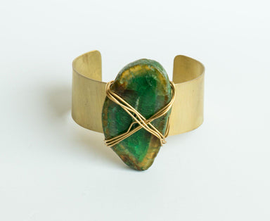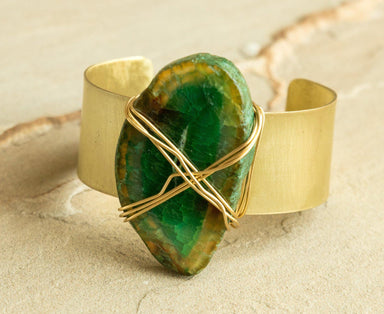 Freeform green agate slice wire wrapped to recycled brass cuff, with matte brush finish. Each cuff will slightly differ due to the freeform stone a...