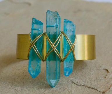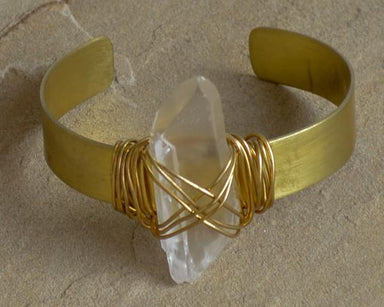 Hand-cut and polished, recycled brass 1/2" cuff with wire wrapped crystal quartz slab. Cuff will fit wrist approximately 6.5 - 7.5". The perfect ad...