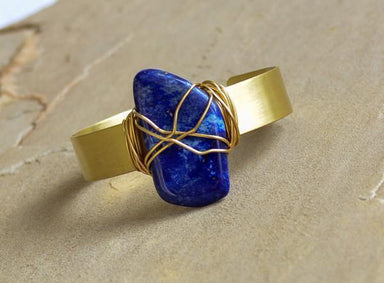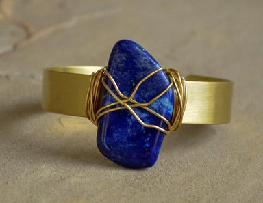 Hand-cut and polished, recycled brass 1/2" cuff with wire wrapped lapis lazuli slab. Cuff will fit wrist approximately 6.5 - 7.5". The perfect addi...