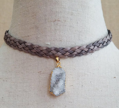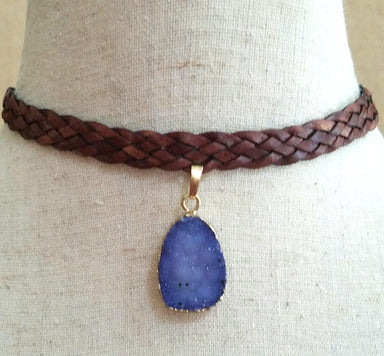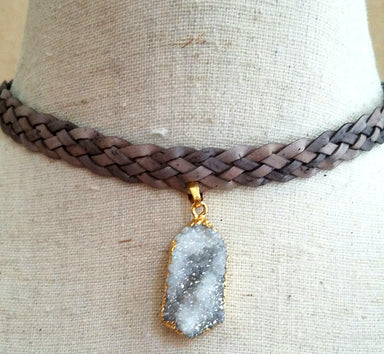 Natural druzy, with gold trim on braided brown leather cord. Adjustable from 13" to 17". Choker style necklace perfect for layering or wearing alon...