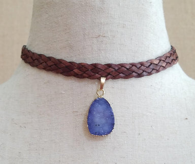 Purple druzy with gold trim on braided brown leather cord. Adjustable from 13" to 17". Choker style necklace perfect for layering or wearing alone....