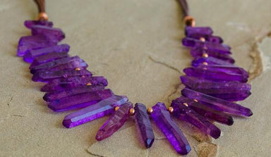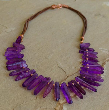 Quartz stick beads and copper spacer beads wire wrapped to multiple strands of leather cord with copper clasp. Available in 20", 24" or 30" length...