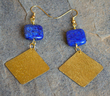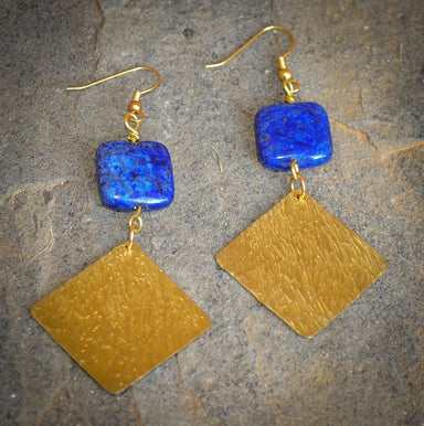 Blue lapis squares and handcut, textured brass squares. Earrings are approximately 2" in length with brass earwires. Every item sold plants a tree ...