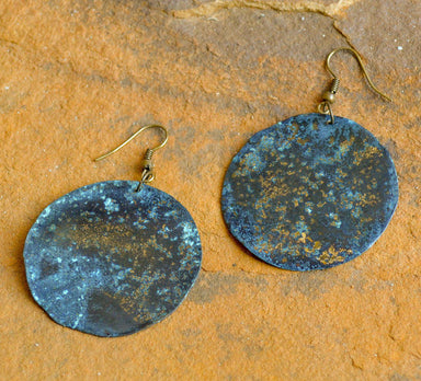 Blue patina created with household products on recycled brass hand cut circles. Metal is available with or without texture. Each earring is unique ...