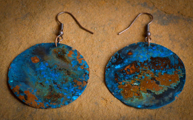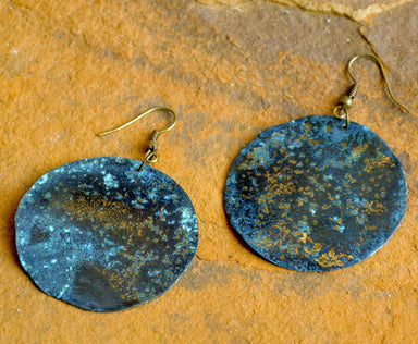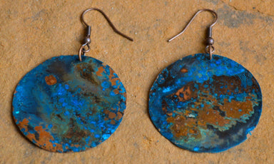 Blue patina created with household products on recycled copper hand cut circles. Metal is available with or without texture. Each earring is unique...
