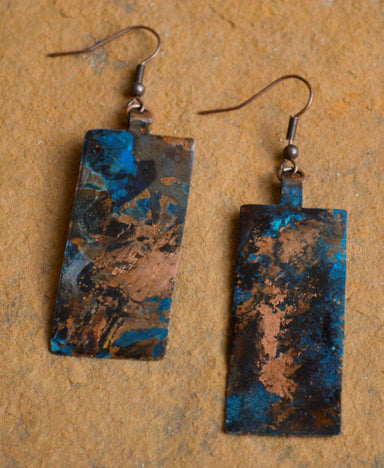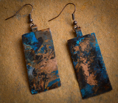 Blue patina created with household products on recycled copper or brass hand cut rectangles. Metal is available with or without texture. Each earri...