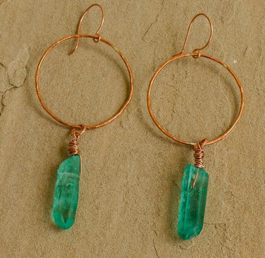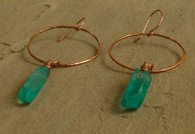 Hammered 1.5" recycled copper hoops with wire wrapped quartz stick. Soul is a perfect piece for your summer wardrobe, a new addition to our element...