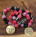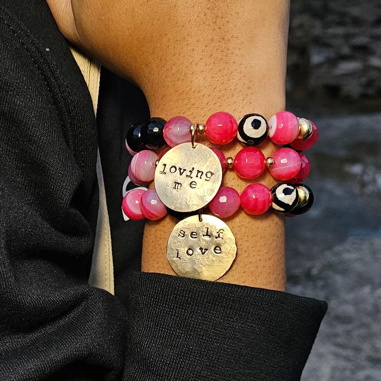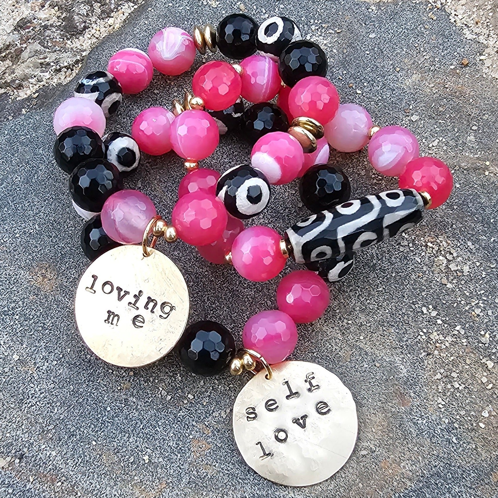 Embrace self-love with this bold stack of 3 bracelets! Handcrafted with pink agate, black onyx, black & white Tibetan agate and hand stamped recycled brass "self love" and "loving me" charm, this set serves as a daily reminder to love yourself. Each bracelet embodies the individuality that lives within. Remember, self love is not selfish. It's essential.