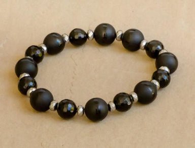 "Phoenix" is a new addition to our evolution collection. Striped matte black onyx, faceted black onyx, silver spacers. Bracelet fits 7.5" to 8.5" w...