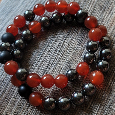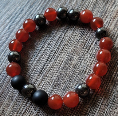 Unisex Hematite & Carnelian Bracelet 10mm smooth hematite, matte black onyx, and carnelian beads. Classic gemstone bracelet makes a bold statem...