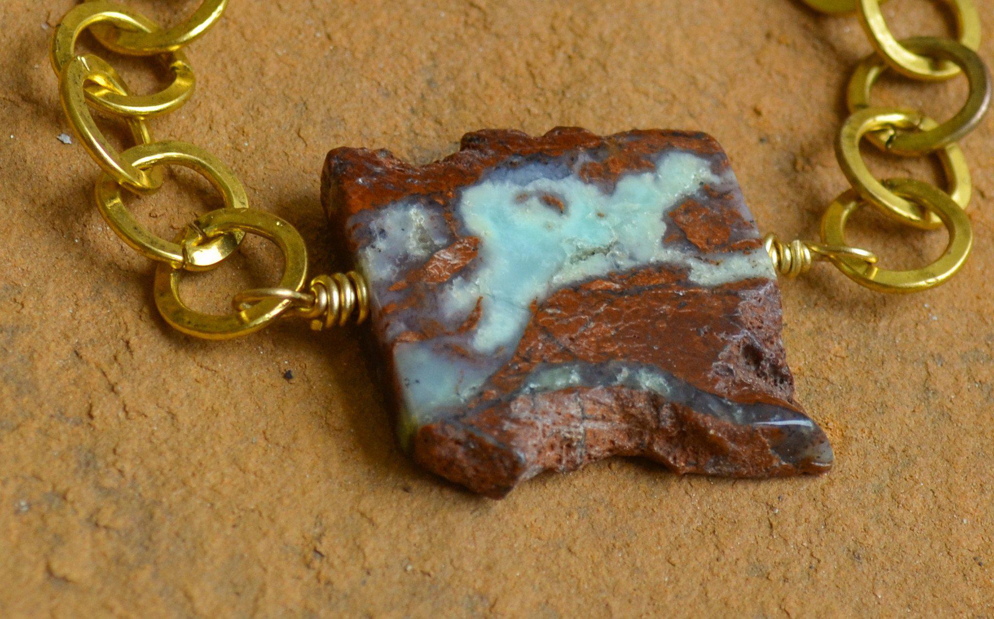 Chrysoprase slab with gold chain. Bracelet is approximately 7" in length with a 2" extender. Customization available upon request.