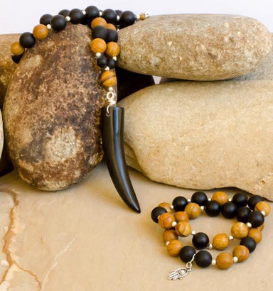 Matte black onyx and pyrite beads with pyrite horn. Unisex. Available in 24" or 30". Coordinating bracelets sold separately. Every item sold plants...