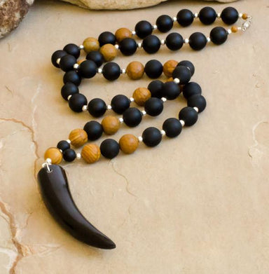 "Axel" is a new addition to our evolution collection. Faceted wood jasper, matte black onyx and platinum hematite spacers with wire-wrapped tusk pe...