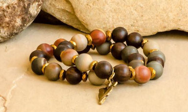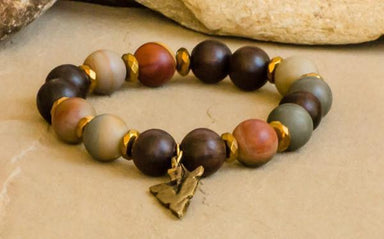 "Micah" is a new addition to our evolution collection. Matte red creek jasper, wood and gold hematite. Bracelet will fit 7.5" - 8" wrist. Coordinat...