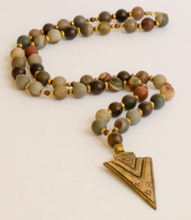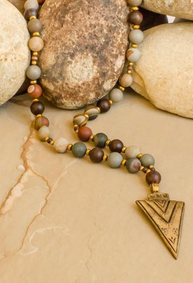 "Micah" is a new addition to our evolution collection. Matte red creek jasper, wood and gold hematite with brass arrowhead. Necklace available in 2...