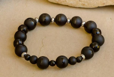 "Phoenix" is a new addition to our evolution collection. Striped matte black onyx, faceted black onyx, silver spacers. Bracelet fits 7.5" to 8.5" w...