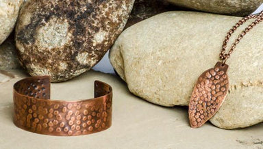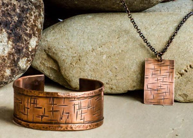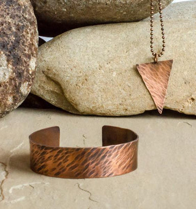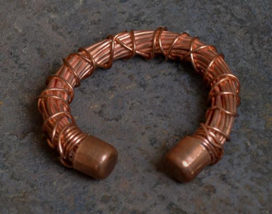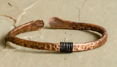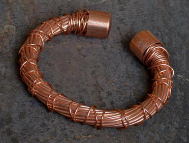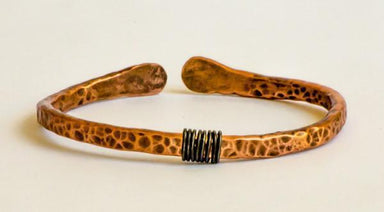 Manipulated with fire and a hammer, copper tubing is used to create this unique metal cuff. Approximately 7" in length and 1" wide. Copper has been...