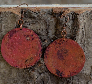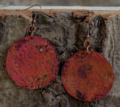 Hand-cut and polished, recycled copper 1.5" circles with a fire red patina applied and sealed. Earrings are approximately 2" in length. No two will...