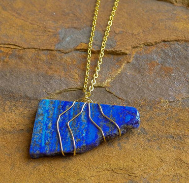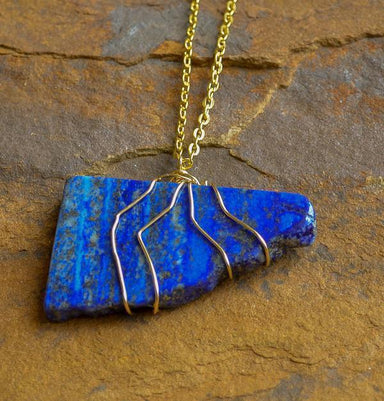Freeform blue lapis slab wire wrapped on gold chain. Necklace available in 16", 20", 24" or 30". Perfect for layering or wearing alone. Each stone ...