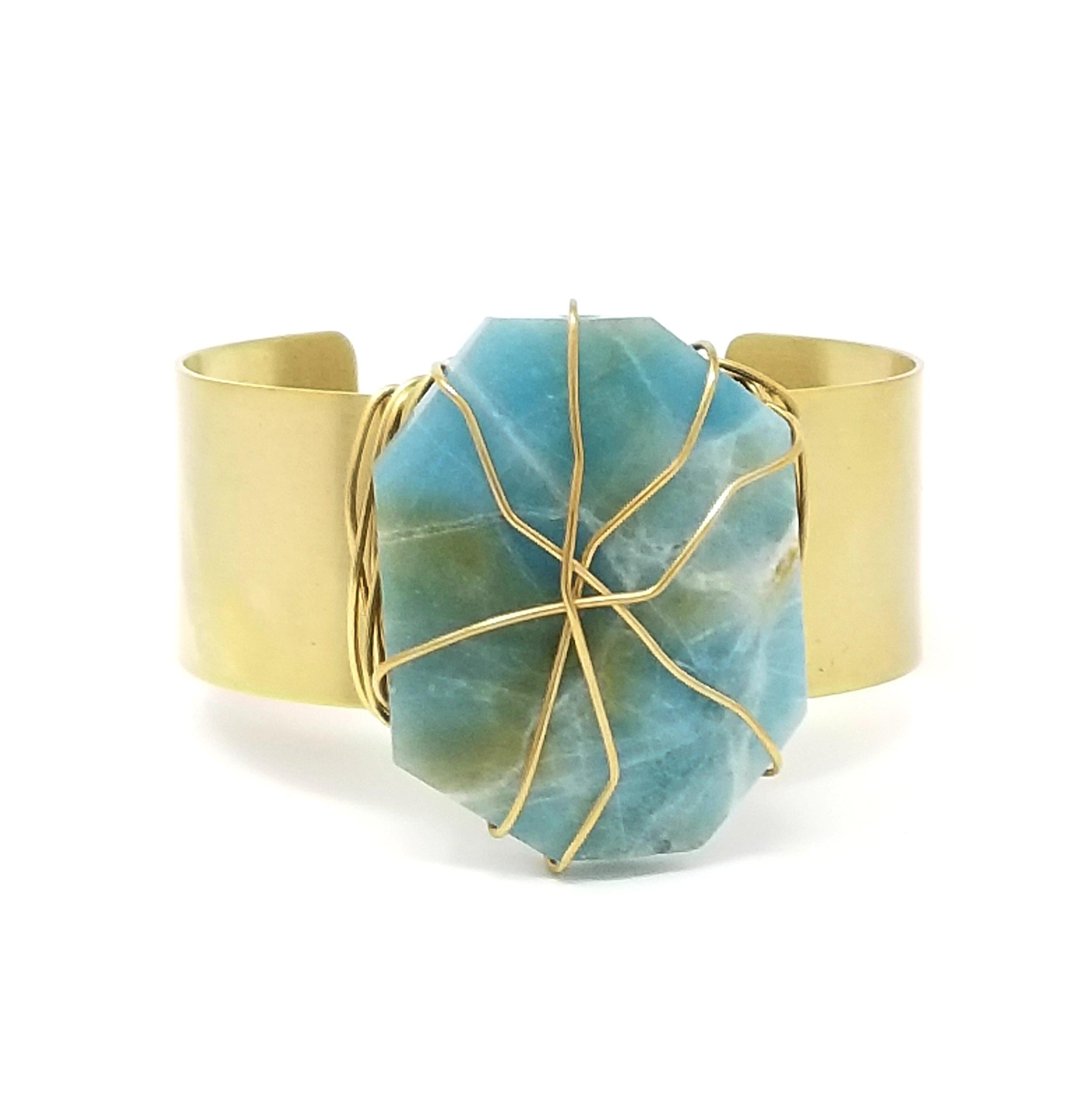 Amazonite slab wire wrapped to 1" recycled brass cuff. Fits wrist 6.5"-7". Each slab is different due to them being natural stones.