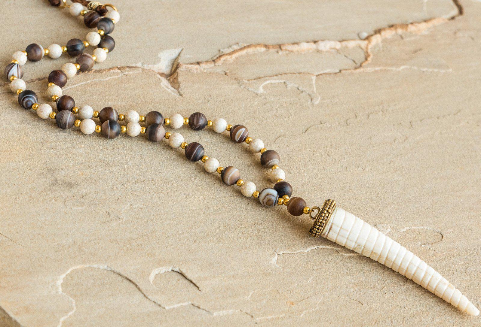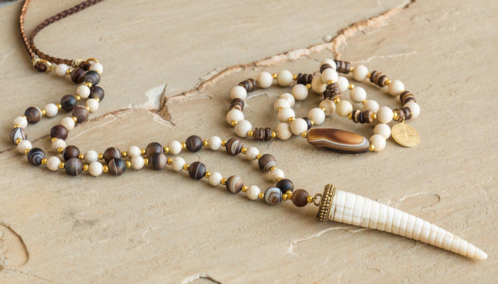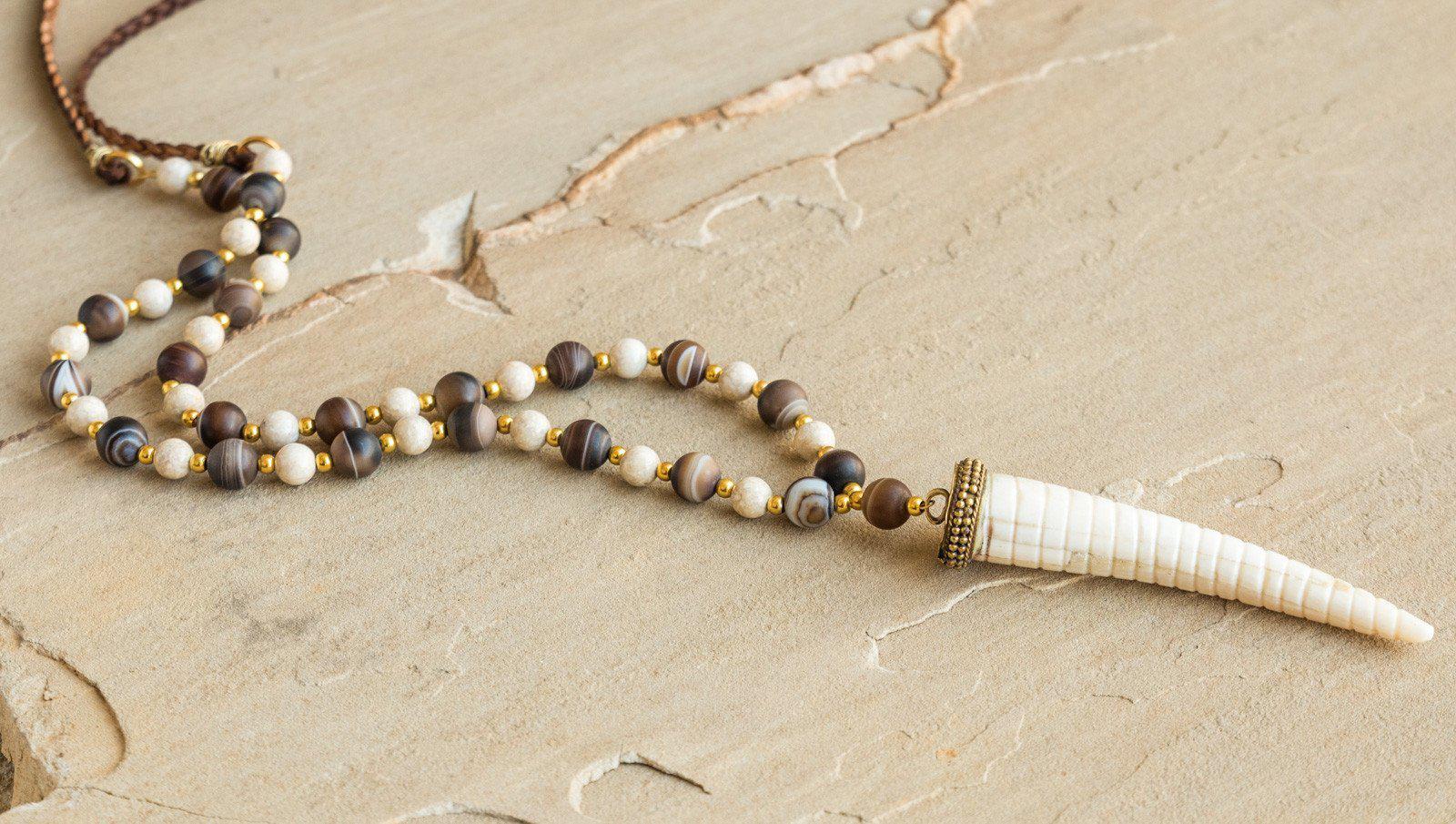 Brown agate, bone, gold hematite and braided leather cord with bone horn. Necklace is approximately 35". Looks great with the Bone Coconut Shell Bracelet Set, which is sold separately.