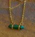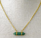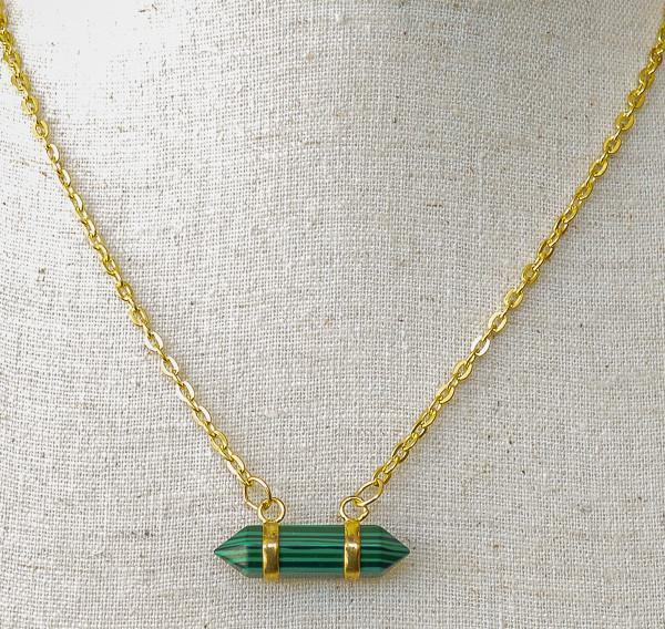 Small, gold-trimmed,double point malachite pendant and gold chain. Available in 16" or 20". Perfect for layering or wearing alone. Each stone is unique and may vary slightly in size and shape.