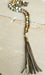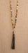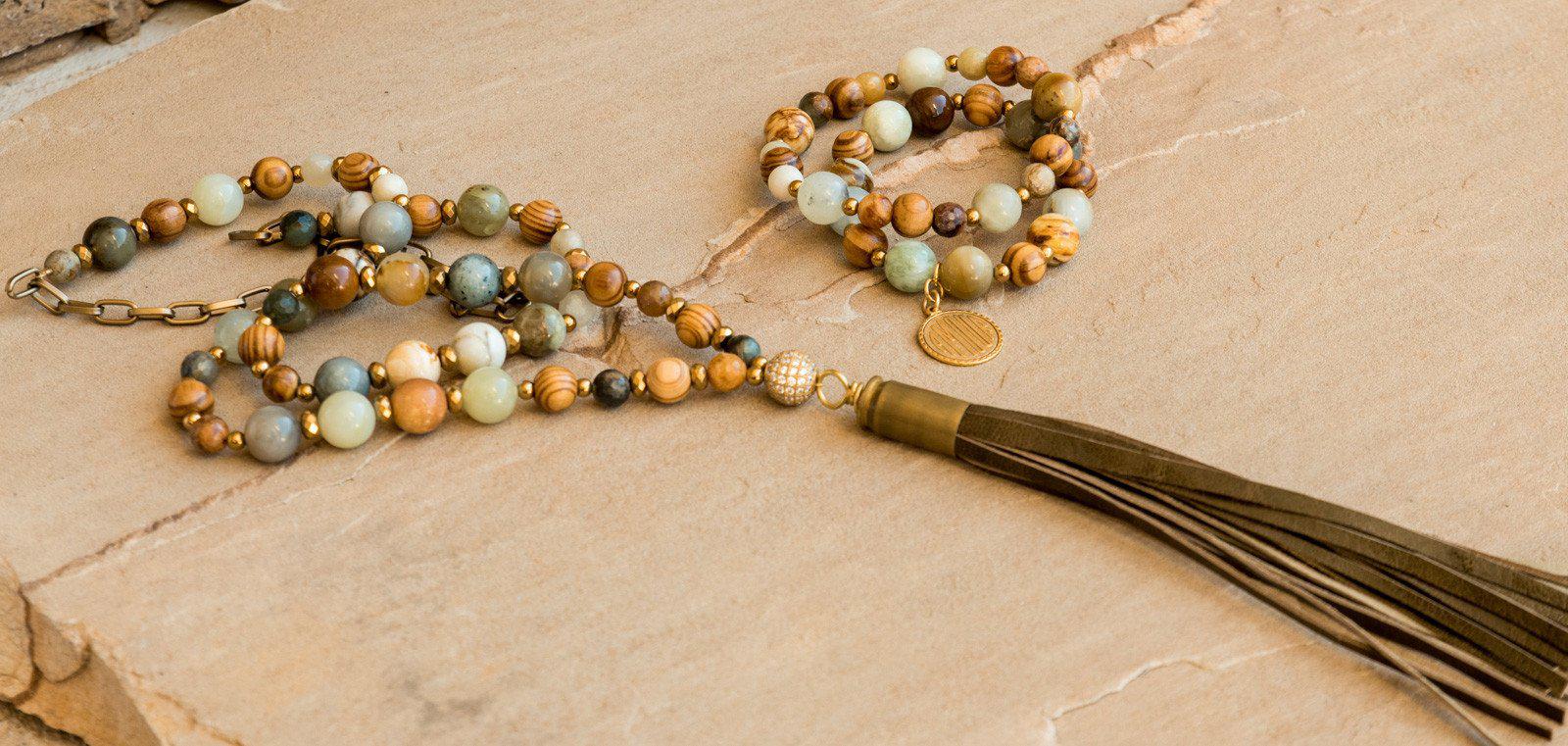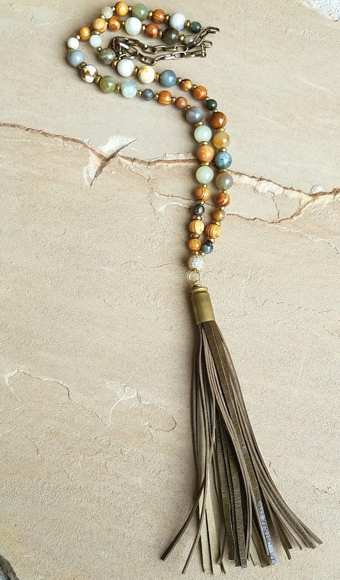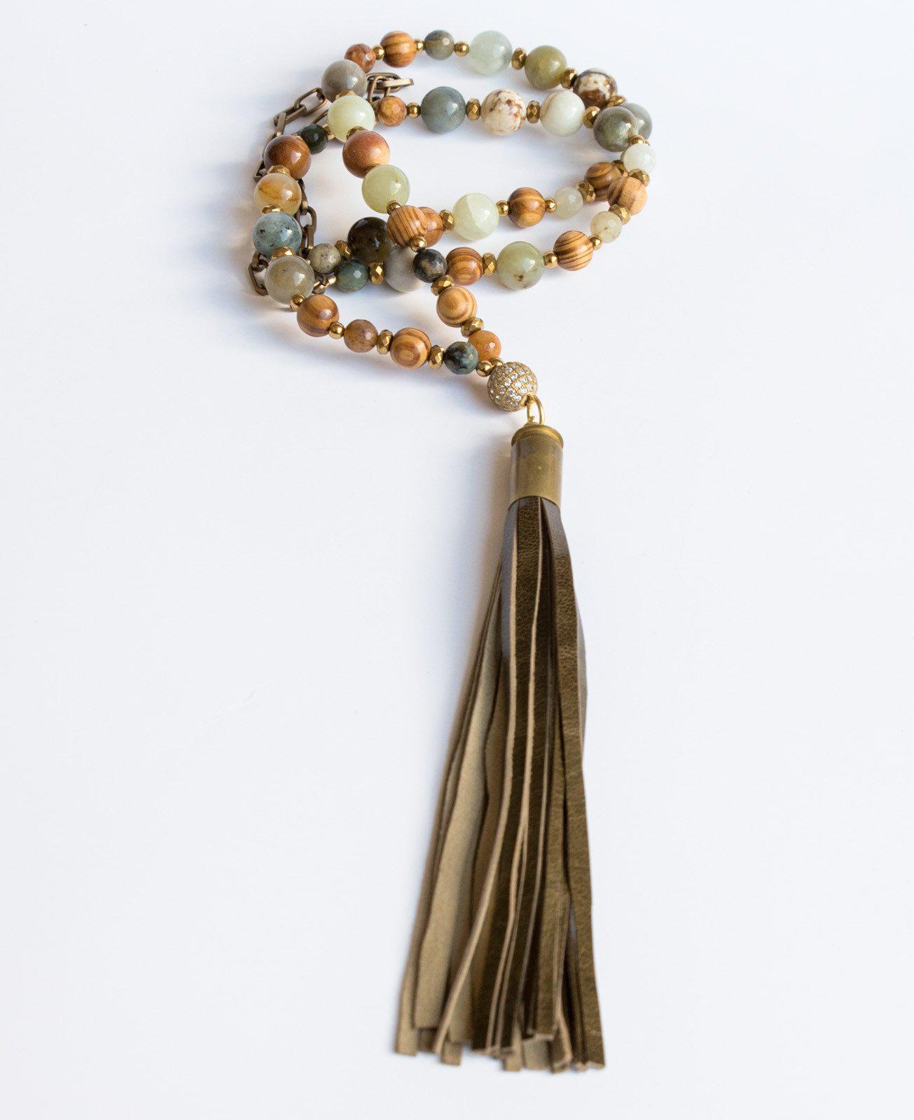 Earth tone agate, gold hematite, wood beads and antique brass chain with micro pave' bead and repurposed olive green lambskin bullet shell tassel. Necklace is approximately 35". Looks great with our Earth Tone Agate Amour Bracelet Set which is sold separately. All of our tassels are handmade from leather remnants sourced from upholstery and garment factories.