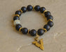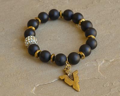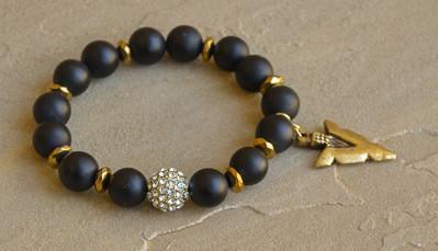 12mm matte black onyx, gold hematite and gold pave' bead with arrowhead charm. Perfect for stacking with other bracelets or wearing alone.