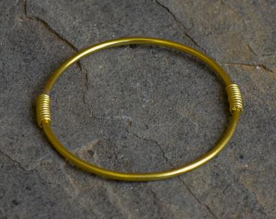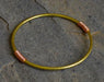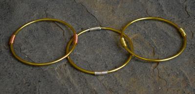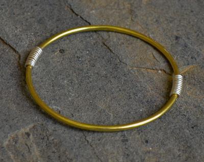 Heavy gauge brass wire bangles with sterling silver, brass or copper accents. Each bangle is sold separately. Available in 2 sizes. S/M (2.5") and M/L (3"). To determine the appropriate size, measure the width of the widest point of your hand. The bangle must go over your hand. 100% recycled metals used. Also available in sterling silver and copper.