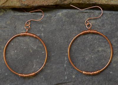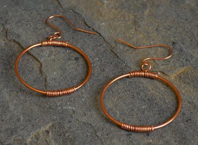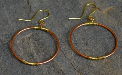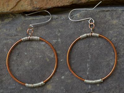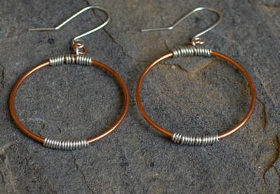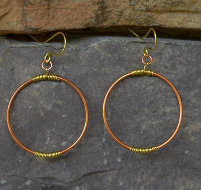 Heavy gauge copper wire hoops with sterling silver, brass or copper accents. Each bangle is sold separately. Approximately 2" in length. Hand crafted earwires. 100% recycled metals used. Also available in sterling silver and brass.