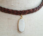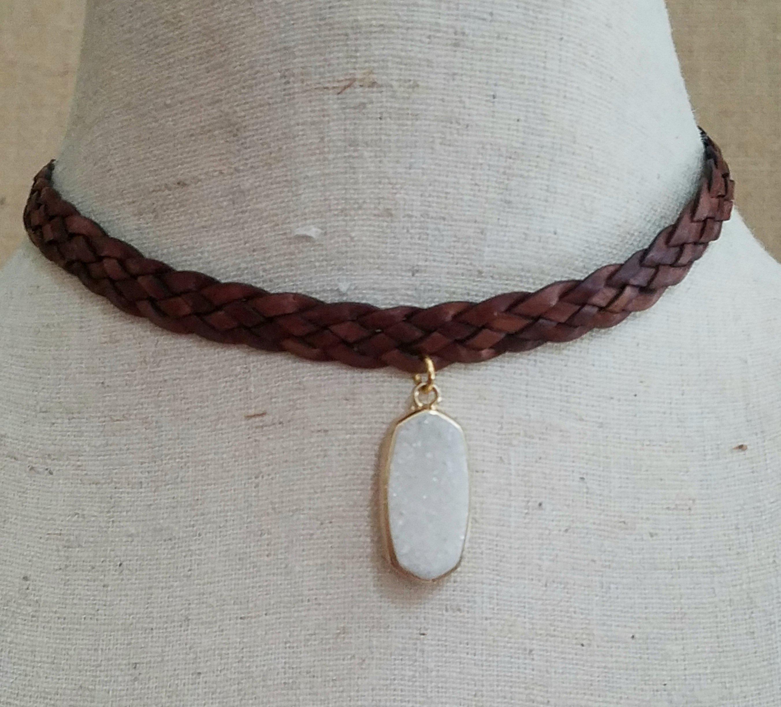Natural druzy, with gold trim on braided brown leather cord. Adjustable from 13" to 17". Choker style necklace perfect for layering or wearing alone.
