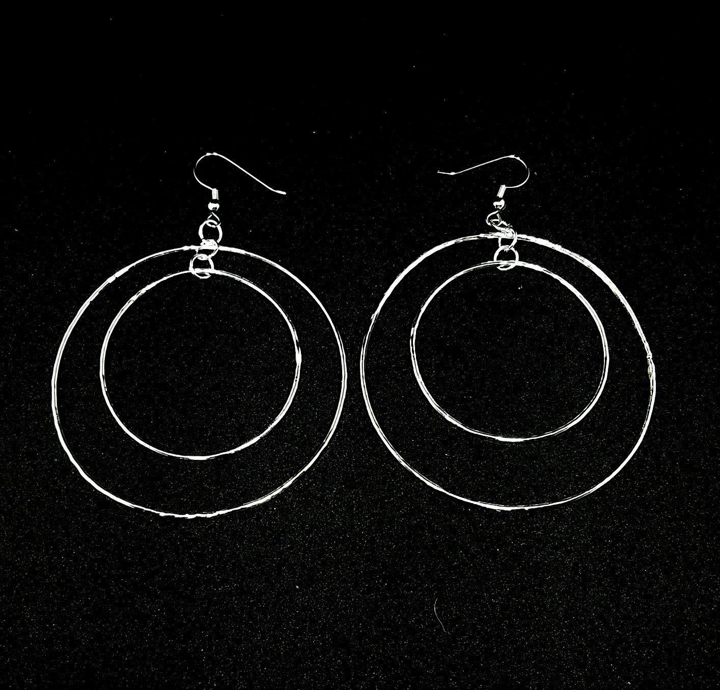 Recycled fine silver double hoops. Large hoop 2.5" in diameter. Small hoop is 1.5" in diameter. Fine silver is 99.9% silver and tarnishes much less than sterling silver. These hoops are perfect for every day wear or special occasions. Polishing cloth included.